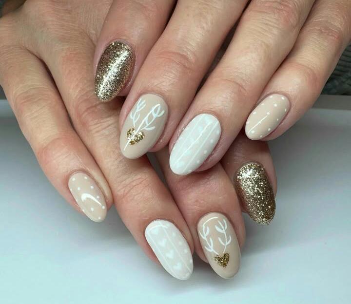 A mix of nude, white, and gold glitter creates a cozy yet elegant Christmas look. Subtle reindeer antlers and tiny gold hearts add a whimsical holiday touch.