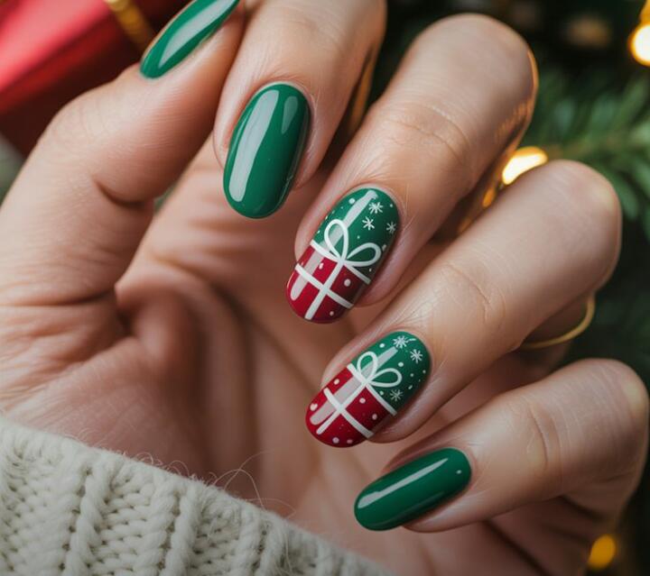 This design uses classic Christmas colors—green and red—with a glossy finish. White ribbon and gift-wrap detailing make the nails look like tiny presents, giving a fun and festive feel.