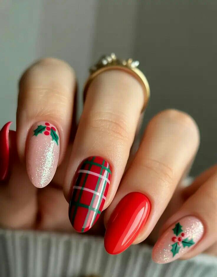 Bold red nails are complemented by soft pink glitter accents and tiny holly leaf designs. The festive plaid accent nail ties everything together with a warm, traditional Christmas feel.
