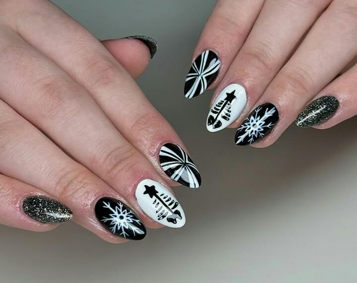 This design features bold black-and-white Christmas patterns, including peppermints, snowflakes, and graphic christmas tree for a modern, high-contrast look. It feels edgy yet festive, perfect for someone who likes Christmas nails with a stylish twist.