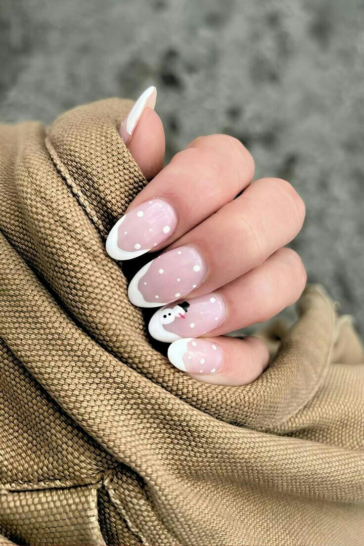 A sheer, milky pink base with white French tips is sprinkled with delicate snowfall dots. The sweet snowman accent nail adds a cozy, whimsical vibe that’s subtle but full of personality.