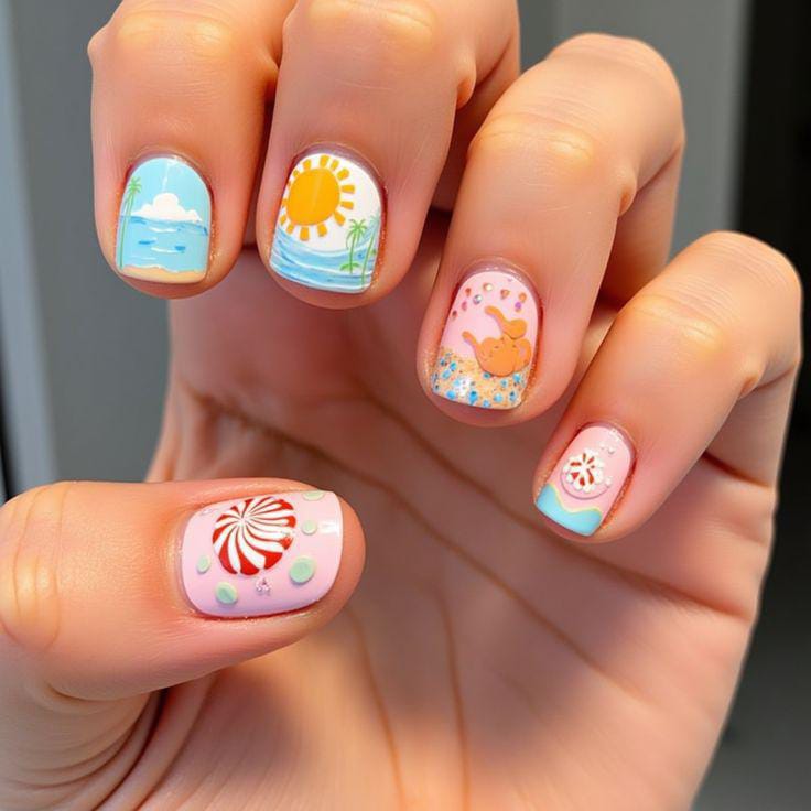 A playful beach-themed set with soft pastel bases, featuring tiny ocean scenes, sunshine, and cute summer icons on short nails. The vibe feels cheerful, whimsical, and perfect for a fun vacation mood.