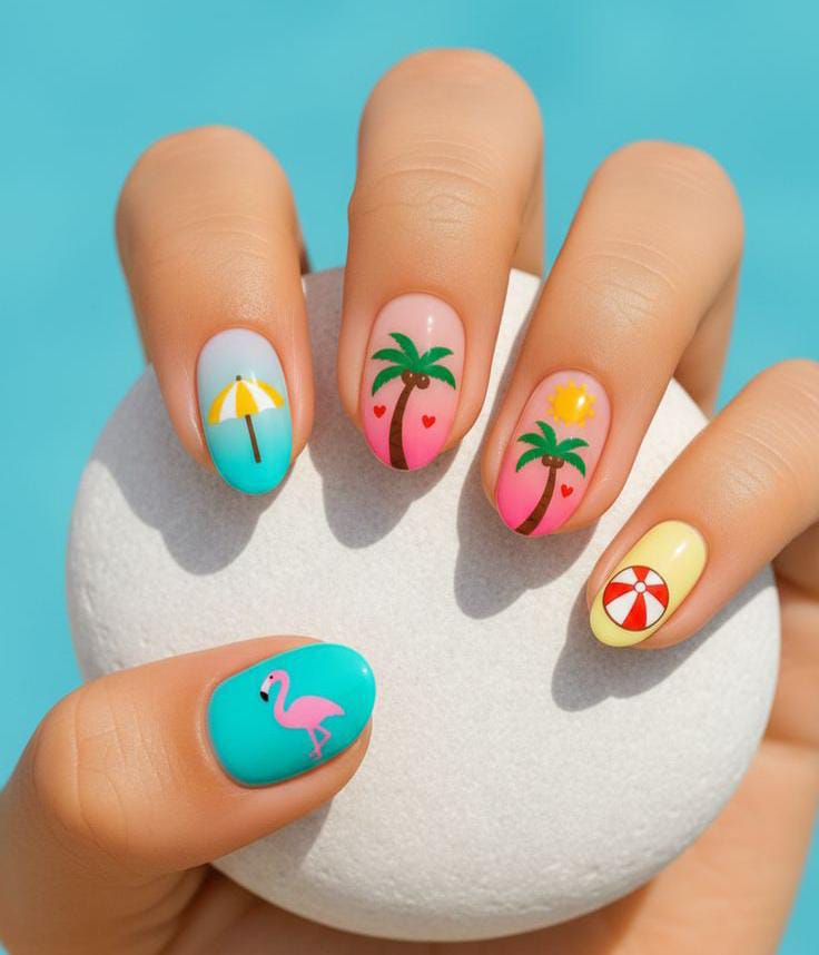 Bright, colorful short ombre nails featuring palm trees, a flamingo, beach umbrella, and sunny icons give a fun, cartoon-like summer vibe. The cheerful mix of blue, pink, and yellow feels bold, cute, and vacation-ready.
