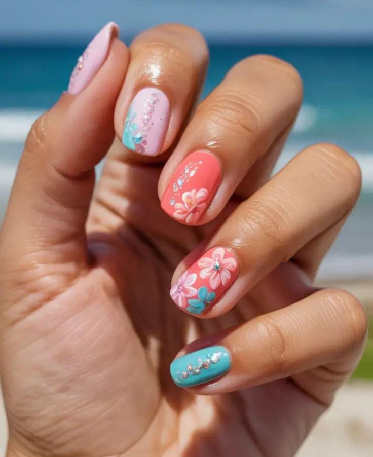 Soft pink, coral, and blue short nails create a bright tropical palette with glossy floral accents and tiny rhinestone details. The overall vibe is fun, summery, and feminine with a beachy pop of color.
