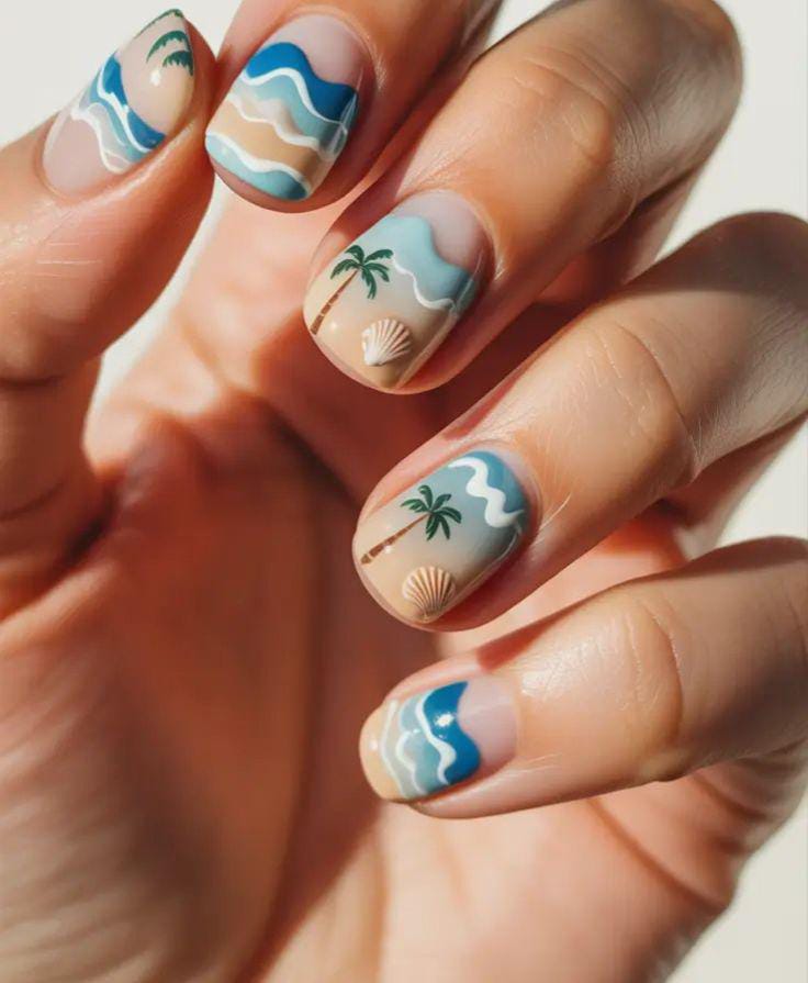 Muted nude and ocean-blue ombre short nails form a calm coastal look with wavy lines, palm trees, and small shell art. The design feels relaxed, minimal, and inspired by a peaceful day at the beach.