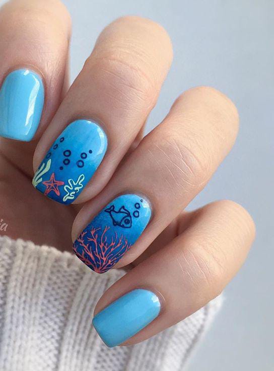 Bright ocean-blue short ombre nails feature playful underwater elements like coral, bubbles, and tiny sea creatures for a fun marine theme. The overall look feels vibrant, cute, and inspired by the beach vibe.