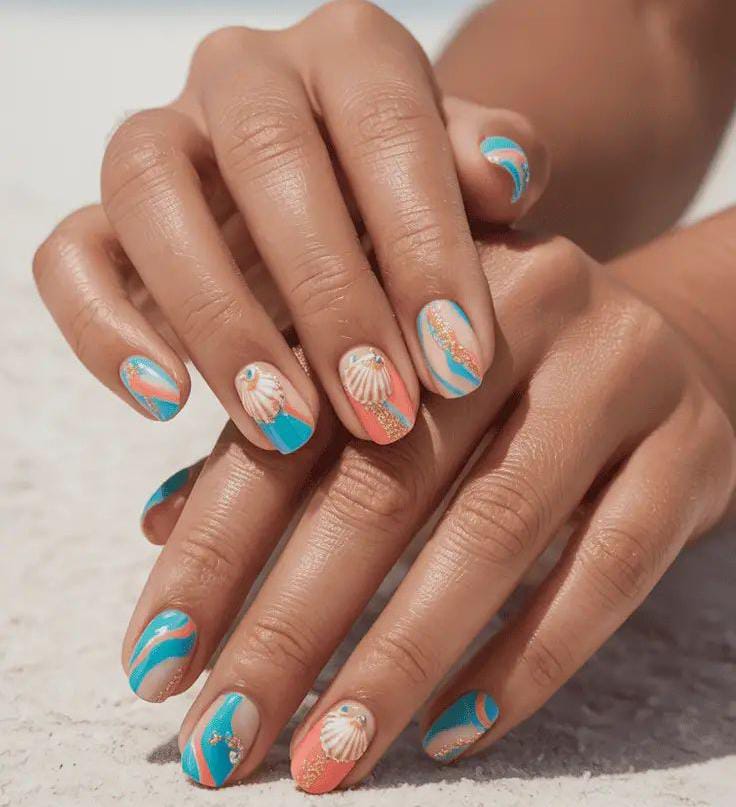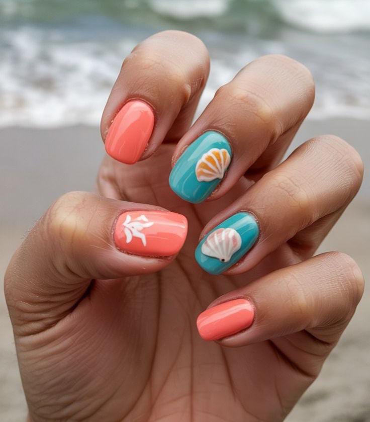 A bright coral and turquoise manicure with cute seashell and starfish details on accent short nails. It has a cheerful, tropical feel that’s perfect for a fun beach vacation look.