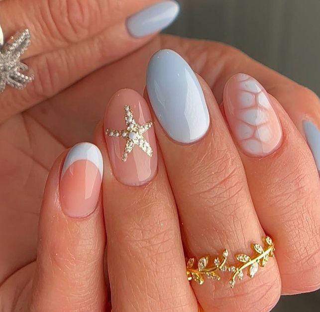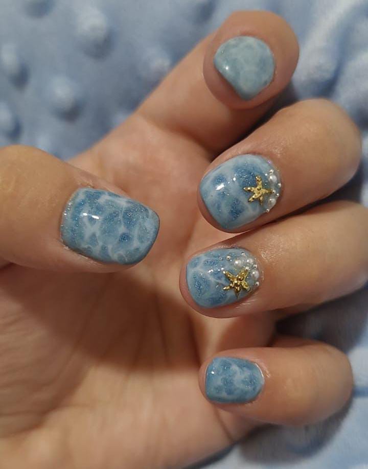 Soft blue short nails with a marbled, watery effect create the look of gentle ocean waves, finished with small gold starfish charms and embellishment. The style feels calm, breezy, and subtly elegant with a beach touch.