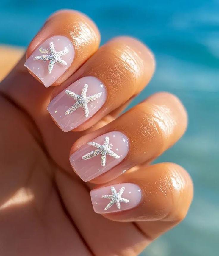 Sheer milky pink short nails are decorated with shimmering white starfish and dots for a clean, ocean-inspired style. The design looks fresh, glossy, and effortlessly beachy with a touch of sparkle.