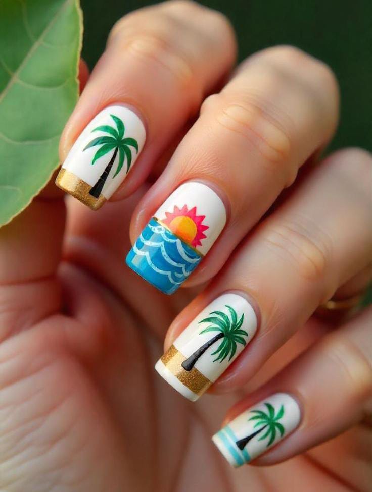 This design features a clean white short nail base with tropical palm trees and a bright ocean sunset accent nail, finished with metallic gold tips. The colors feel warm and summery, giving a relaxed vacation-by-the-beach vibe.