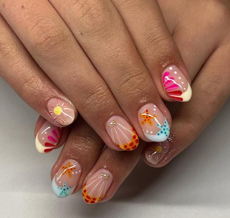 This look uses a soft nude short nail base with colorful seashell, starfish, gold stud and floral details paired with playful French tips. The mix of pastel and bright tones creates a fun, cute beachy aesthetic.