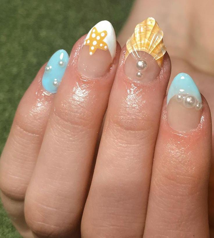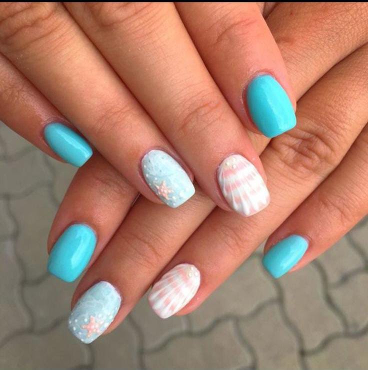 This design combines bright aqua short nails with soft pastel accent nails featuring seashell textures and tiny starfish dot details. The overall look feels fresh, beachy, and light with a calm ocean-inspired palette.
