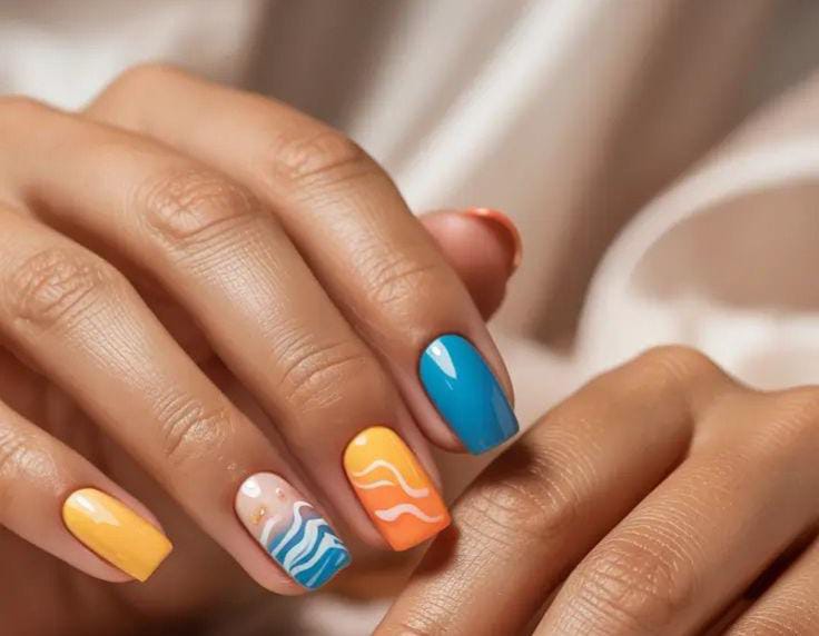 A bright, color-blocked manicure with bold yellow, orange, and blue ombre short nails paired with simple waves and sunset accents. It has a clean, contemporary beach vibe that feels fresh and stylish.