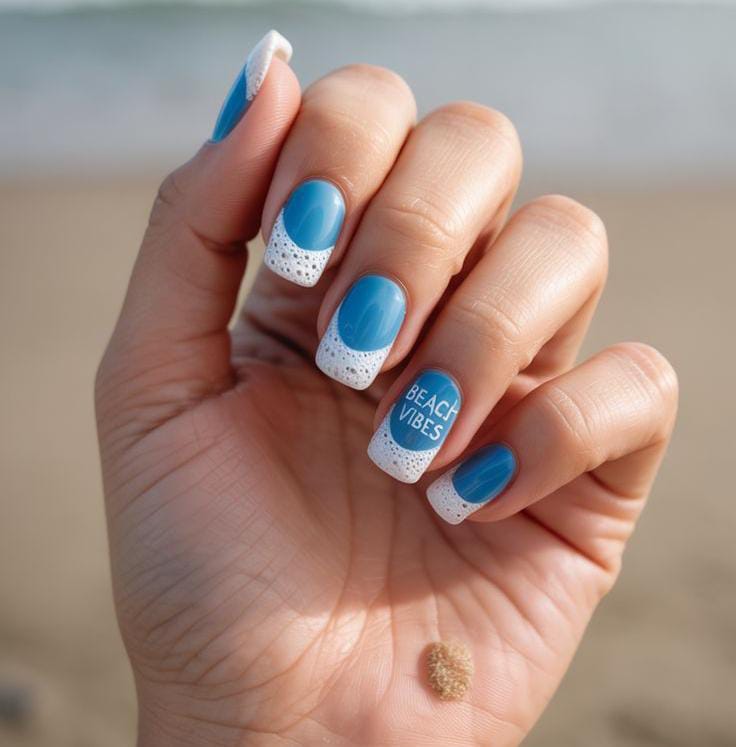 This style features glossy ocean-blue nails paired with white foamy French tips that mimic sea waves, plus a fun “Beach Vibes” accent nail. The design gives a clean, modern seaside aesthetic with a playful summer mood.