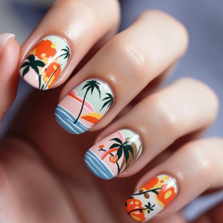 A playful tropical short nail design with pastel backgrounds, palm trees, waves, and bright sunset florals in orange, pink, and blue tones. The vibe feels cheerful, beachy, and slightly retro.