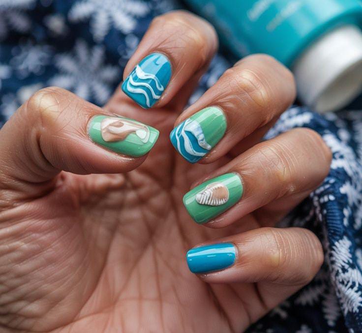 A cool-toned look with blue and mint green short nail shades, featuring wavy ocean lines and delicate raised shell accents. It gives a fresh, calm beach vibe with a modern touch.