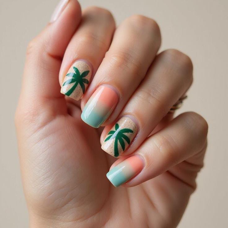 A gentle beach-inspired design with sandy textures, green palm silhouettes, and smooth coral, nude-to-aqua gradient short ombre nails. The overall vibe feels warm, relaxed, and tropical yet minimal.
