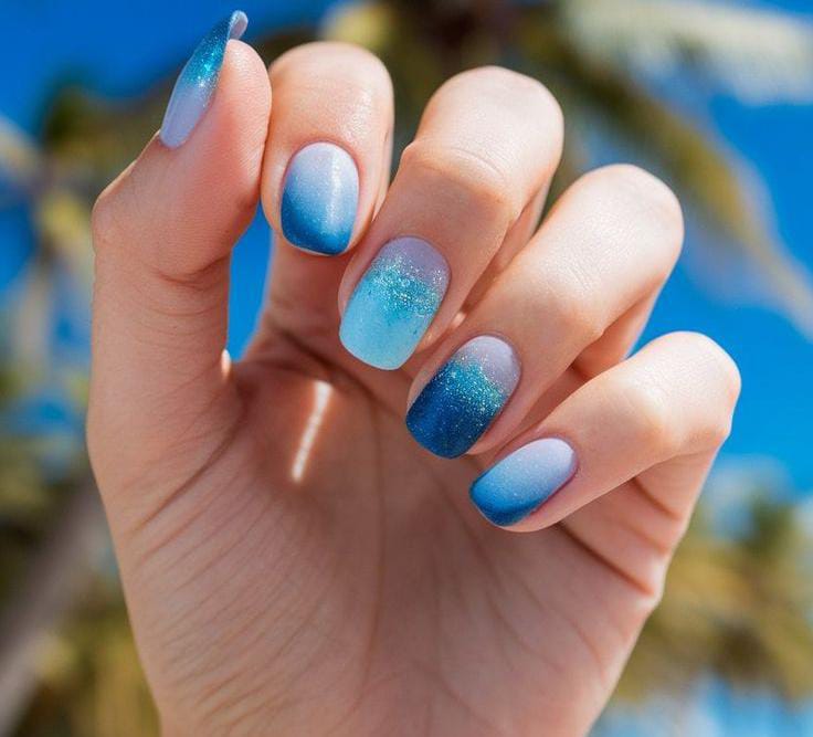 A dreamy blue ombre short gradient manicure with soft shimmer accents that mimic sunlight reflecting on water. It gives a fresh, airy ocean vibe with a slightly beach glow.