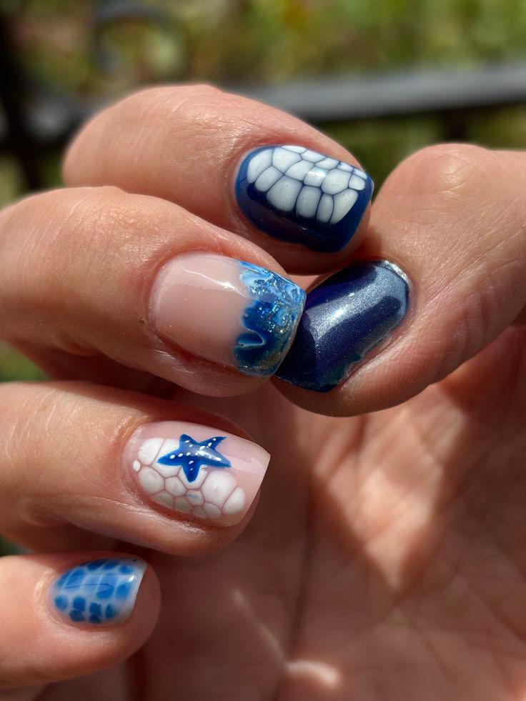 A bold ocean-inspired short nail design with deep navy metallic polish, nude, wave textures, and a bright starfish accent. It gives a rich, beach vibe that feels dramatic yet coastal.
