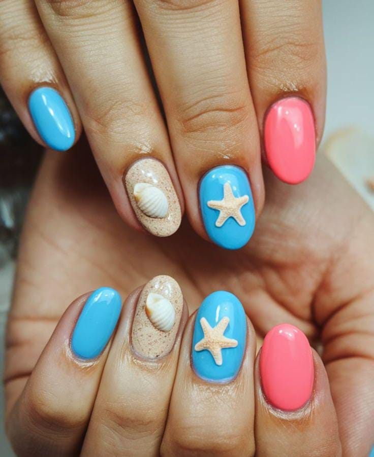 Bright blue and coral pink short nails are paired with sandy nude accents featuring tiny raised seashell and starfish decorations. The overall vibe is playful, summery, and inspired by a cheerful beach day.