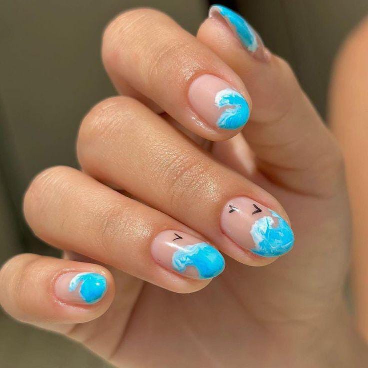 Sheer nude short nails are decorated with soft blue wave tips that look like ocean water meeting the sand and flying birds accent. The design feels fresh, minimal, and effortlessly beachy with a delicate touch.