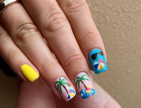 A vibrant summer manicure with bright yellow, blue, and nude pink short nails featuring palm trees, beach balls, and playful seaside details. The overall vibe is fun, colorful, and full of vacation beach energy.