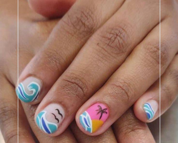 Short nails feature abstract blue waves, a bright sunset on pink accent with a palm tree, and small bird silhouettes. The overall vibe is fun, tropical, and playful with a vacation-inspired beach feel.