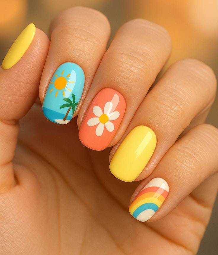 This short nail design features bright summer shades like yellow, coral, and blue with cute beach-inspired art including a sun, palm tree, flower, and rainbow accent. The overall vibe is playful, cheerful, and perfect for a fun tropical vacation on beach look.