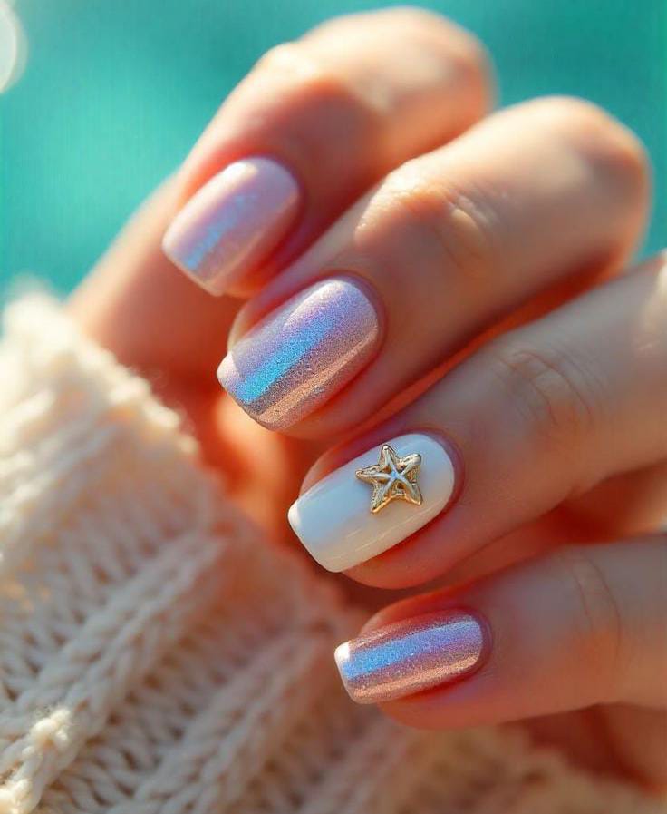 This set uses soft iridescent chrome short nails paired with a milky white accent nail topped with a small 3d gold starfish charm. The vibe feels dreamy, beachy, and slightly mermaid-inspired with a clean, elegant finish.