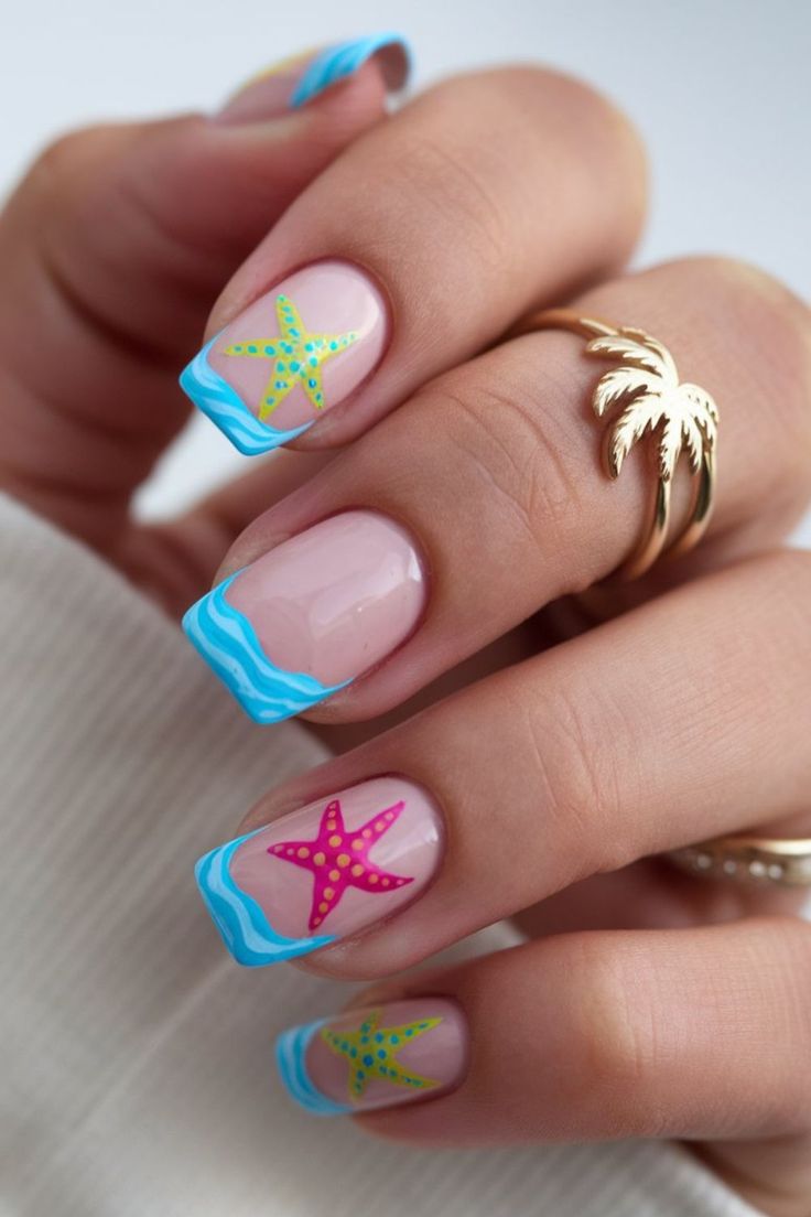 This design features a sheer nude short nail base with bright blue wave French tips paired with colorful starfish accents. The vibe is fresh, beachy, and playful with a cute ocean-inspired feel.