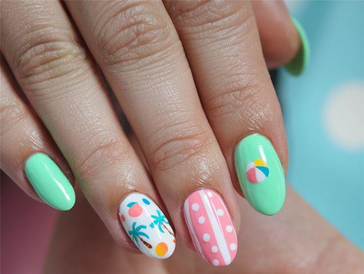 This set combines soft mint green, pink polka dots, and fun tropical details like palm trees and a tiny beach ball on short nails. The overall style feels lighthearted, summery, and perfect for a cheerful vacation look.