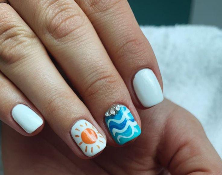 This design combines crisp white short nails with playful accents like a simple sun illustration and blue ocean wave patterns with tiny rhinestone details. The overall vibe feels clean, bright, and beach-ready with a fun coastal touch.