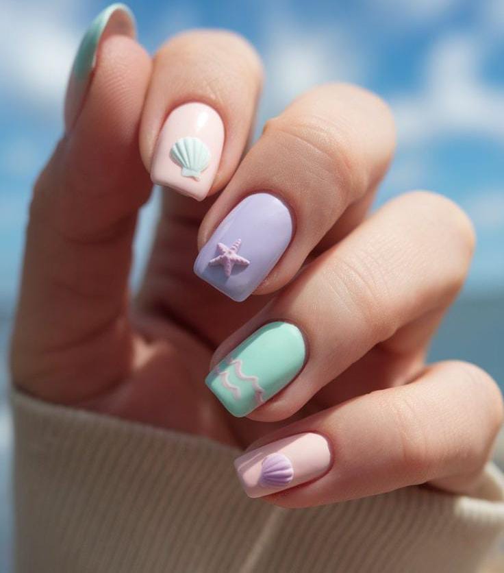 This set features muted pastel shades like mint, lavender, and blush paired with small 3D seashell and starfish short nails. The style feels delicate, dreamy, and inspired by a calm beach aesthetic.