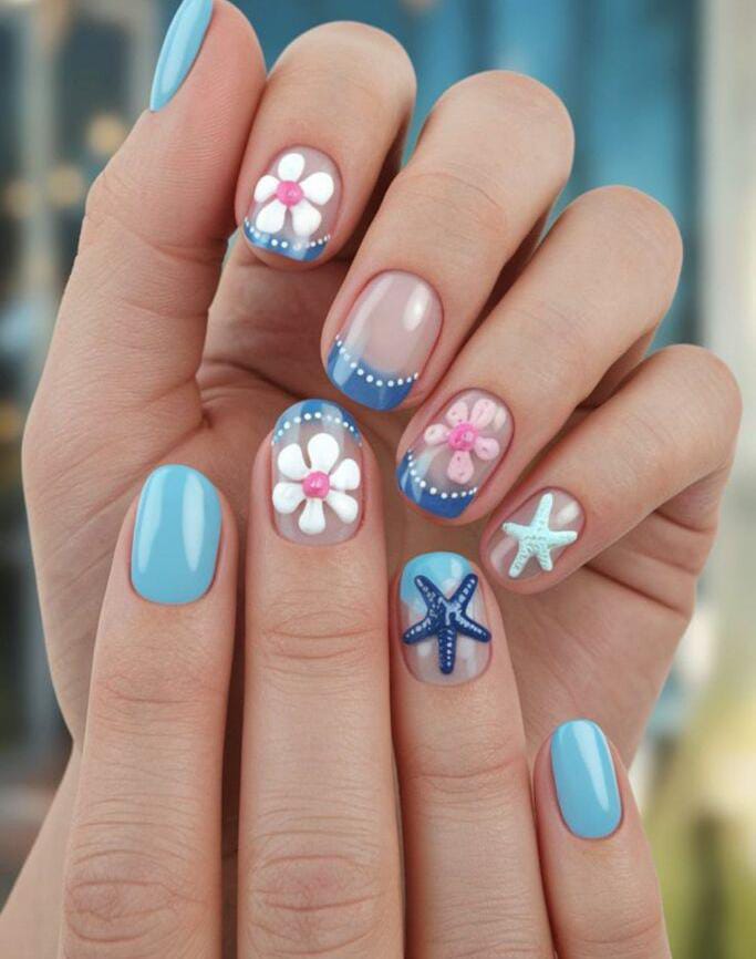 Soft blue tones and sheer nude short nail bases create a fresh beachy look with tiny flowers, dotted accents, and starfish details. The overall vibe is playful, summery, and cute with a clean short-nail finish.