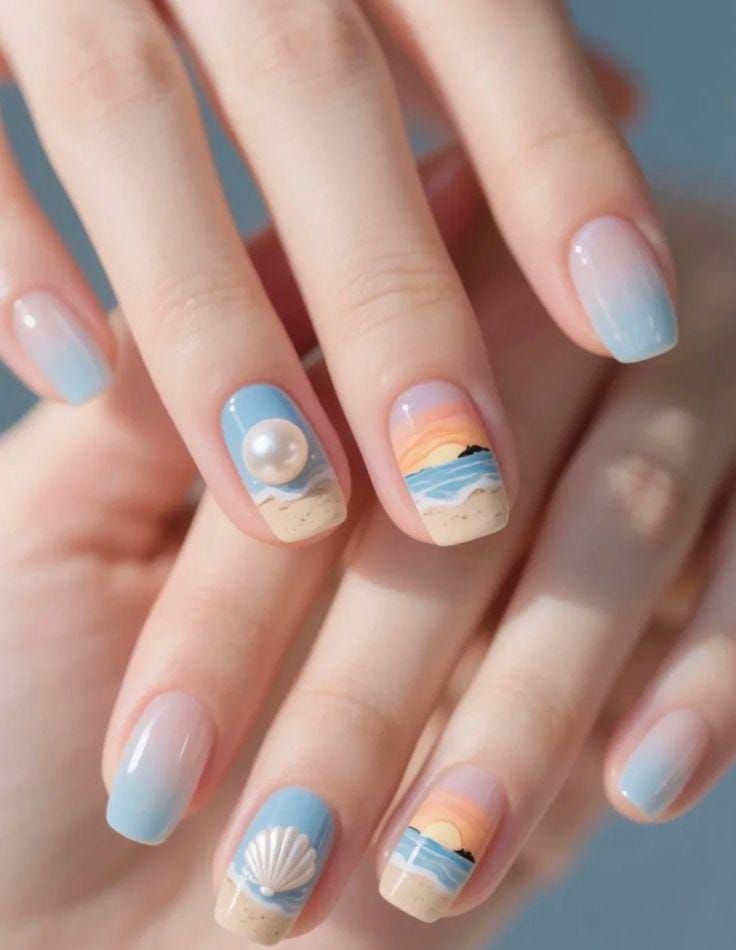 A pastel blue and nude ombre short nail pairs with miniature beach scenes, seashell, bold pearl accents, and sandy textures for a calm ocean-inspired style. The design feels serene and dreamy, like a peaceful sunset by the beach.