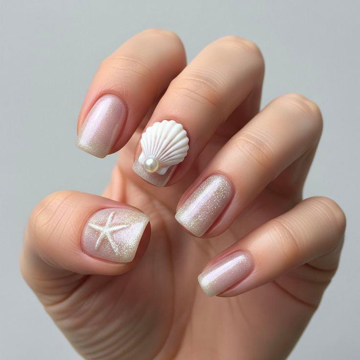 A soft pearlescent nude shimmer creates an elegant beach-inspired base with delicate starfish art and a raised seashell accent. The look feels classy, minimal, and beach-luxurious while still perfect for short nails