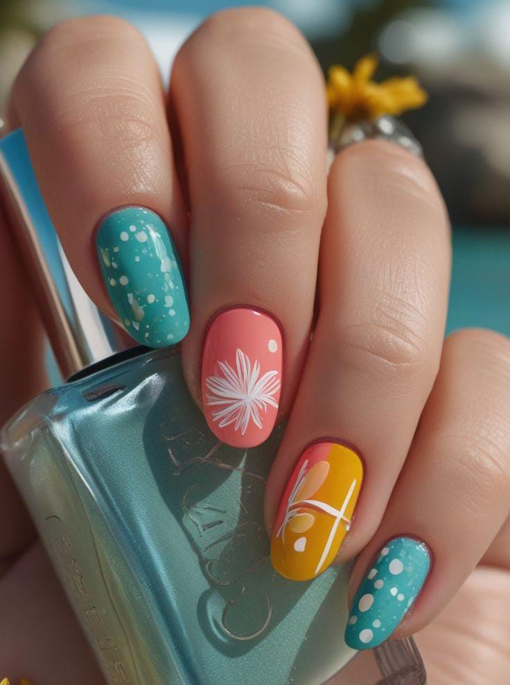 A glossy mix of teal, coral, and mustard short nails with delicate white floral accents and splash-like dot patterns. It feels fresh, artsy, and inspired by tropical beach flowers.