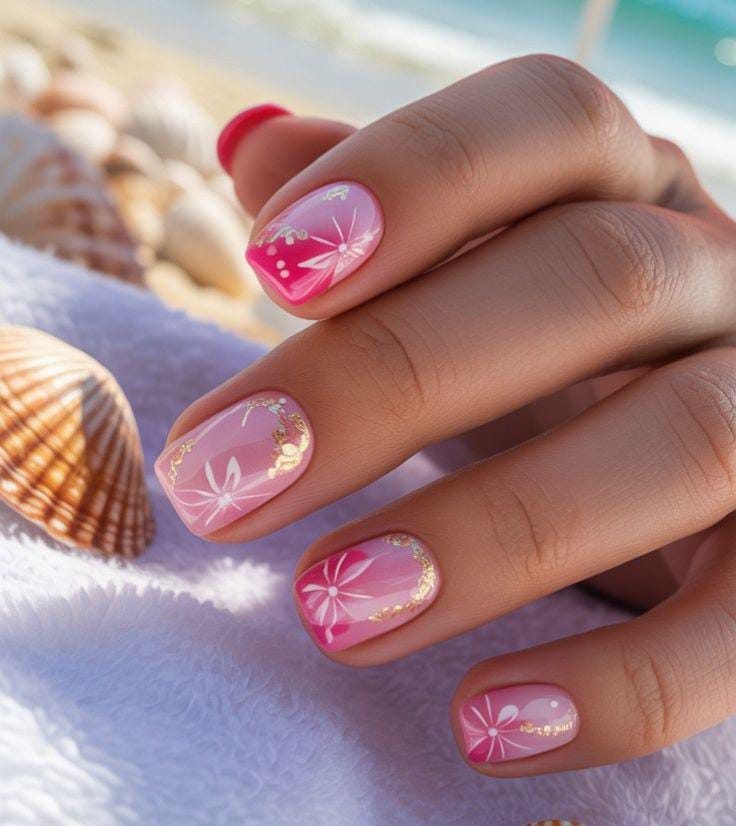 Bright and soft pink ombre short nails, accented by delicate white floral patterns and hints of gold foil. The overall vibe is vibrant, feminine, and playful with a sunny beach vacation feel.