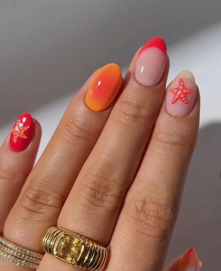 A warm coral and orange ombré set with glossy finishes and cute starfish accents on a soft nude short nail tip base. The overall vibe feels tropical, summery, and bright like a beach sunset.