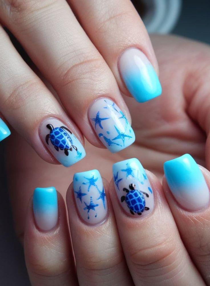 A cool blue ombre gradient design with tiny sea turtles and starfish art scattered over a milky short nail base. It gives a fresh, calm ocean-inspired look that feels playful and beachy.