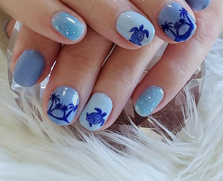 Muted and bright blue short shimmer nails with simple turtle and palm tree silhouettes create a calm, ocean-inspired design with a slightly artistic feel. The overall vibe is relaxed and coastal, like a quiet day by the beach.
