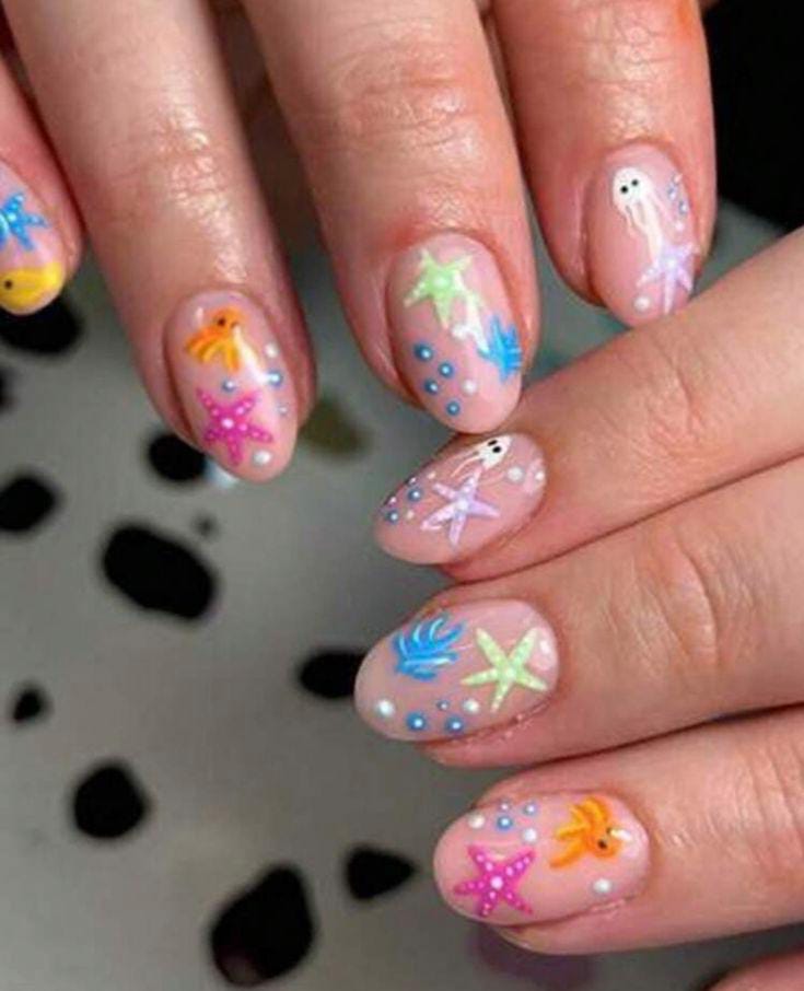 A natural short nail base filled with colorful starfish, tiny jellyfish, and dotted bubble details creates a fun seaside theme. The overall vibe is cute, bright, and youthful with a whimsical beach feel.