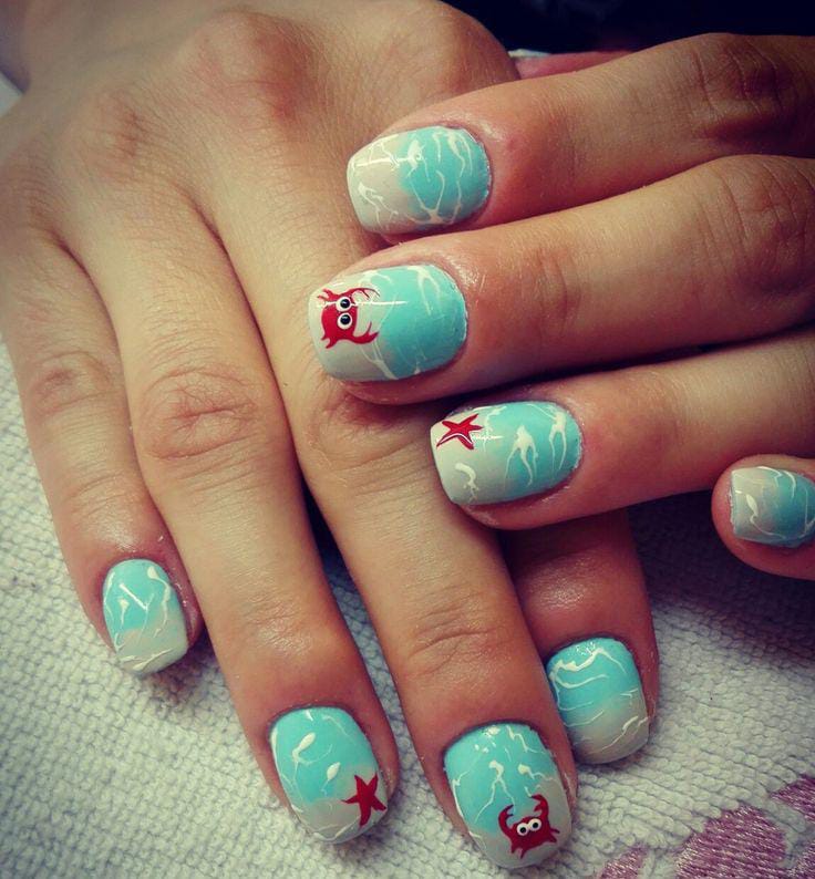 Soft aqua-blue short nails fade into a gray tip with delicate white wave-like lines, accented by tiny red crabs and starfish. The overall vibe is playful, beachy, and cute with a light summer feel.