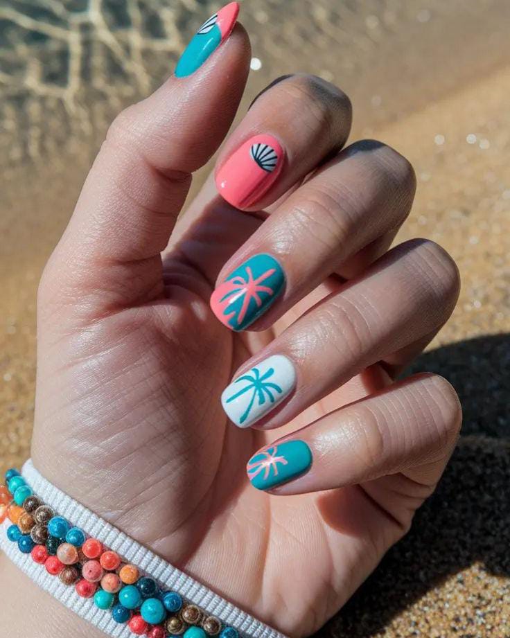 Bright coral, teal, and white short nails feature simple palm and shell graphics for a fun coastal look. The style feels bold, modern, and perfect for a sunny beach vacation mood.