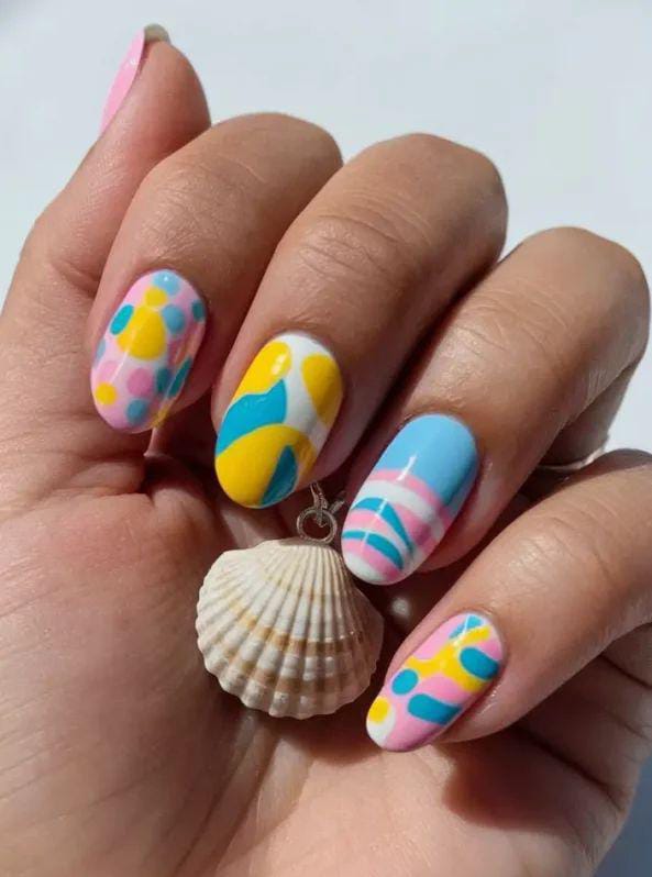 Soft pastel pink, blue, and bright yellow short nails with abstract shapes and playful dots for a cheerful seaside look. The vibe feels fun, artsy, and bright like beach candy colors.