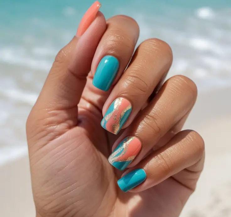 A glossy mix of teal and coral short nails with flowing metallic wave accents that mimic ocean movement. The vibe feels warm, beachy, and slightly glam like a beach sunset.