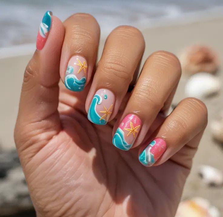 Blue waves, pink and nude short nails are paired with tiny golden starfish details for a cute seaside-inspired design. The overall style is tropical, glossy, and perfect for a beach vacation mood.
