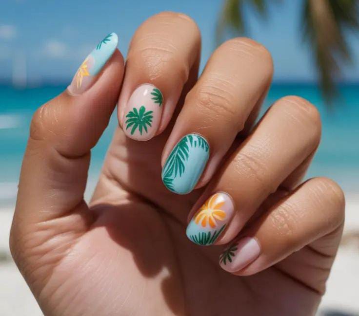 Soft pastel shades with tiny palm leaves and floral accents create a fresh, beachy look on short nails. The mix of nude, aqua, and sunny yellow feels light, playful, and perfect for a tropical beach vibe.