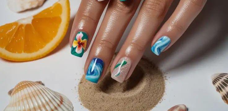 Bright green and blue short nails with wave-like swirls and a bold hibiscus flower give this design a vibrant seaside energy. The sandy shimmer accent adds a fun, summery contrast that feels lively and vacation-ready beach vibe.