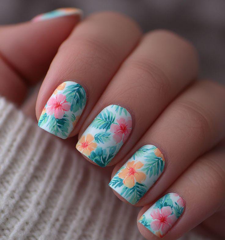 Soft white short nail base paired with delicate tropical flowers and leafy patterns create a calm, breezy beach feel. The overall look is fresh, feminine, and gently inspired by island florals.